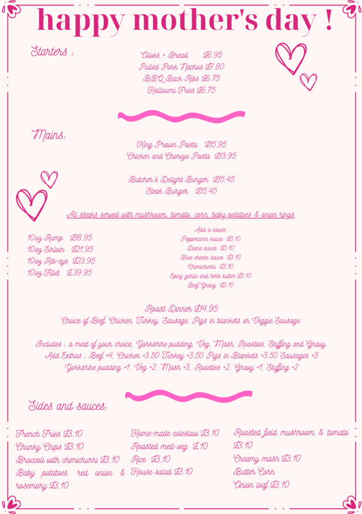 Join us at The Butcher’s Bar & Grill and treat Mum to a relaxed, heartfelt celebration with delicious food, friendly service and a cosy setting the whole family can enjoy.